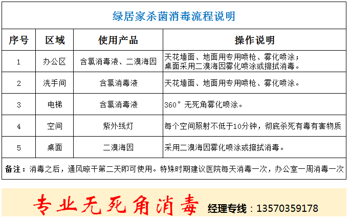 針對此次病疫,綠居家推出針對性防御方案,按照國家疾控中心的消毒要求,采用針對性的消毒產(chǎn)品,加上無刺激的中性消毒劑,全方位殺滅室內(nèi)有毒有害物質(zhì)。給您一個(gè)安全、健康、舒適的居住、辦公、學(xué)習(xí)的環(huán)境!