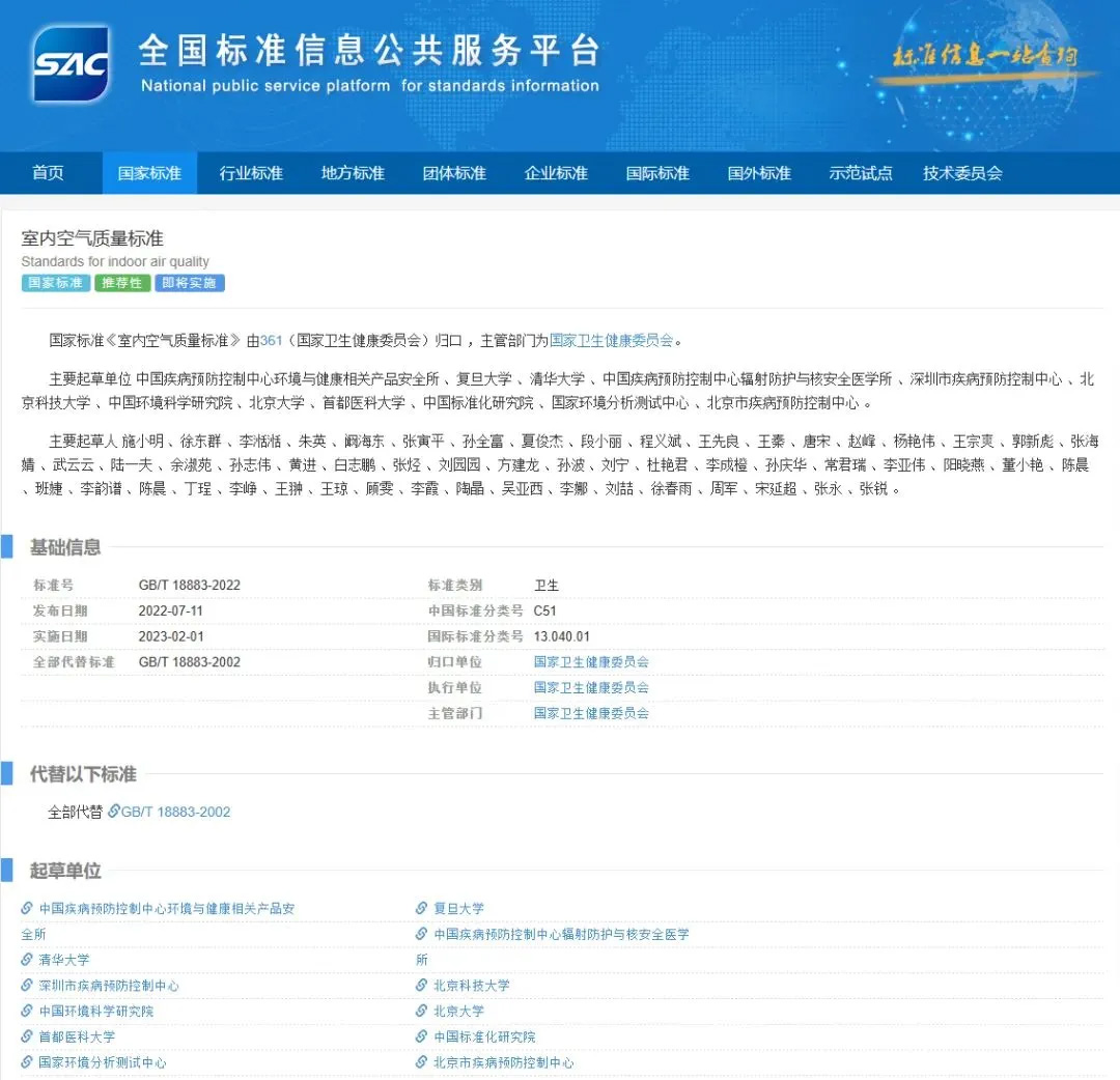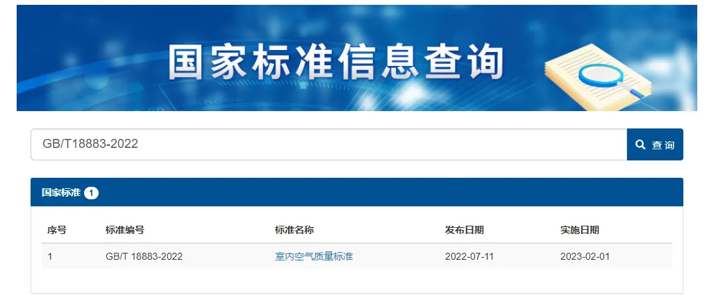 由國家市場監(jiān)督管理總局與國家標(biāo)準(zhǔn)化管理委員會(huì)批準(zhǔn)發(fā)布的GB/T 18883-2022《室內(nèi)空氣質(zhì)量標(biāo)準(zhǔn)》自2023年2月1日起正式實(shí)施,歸口單位為國家衛(wèi)生健康委員會(huì)。