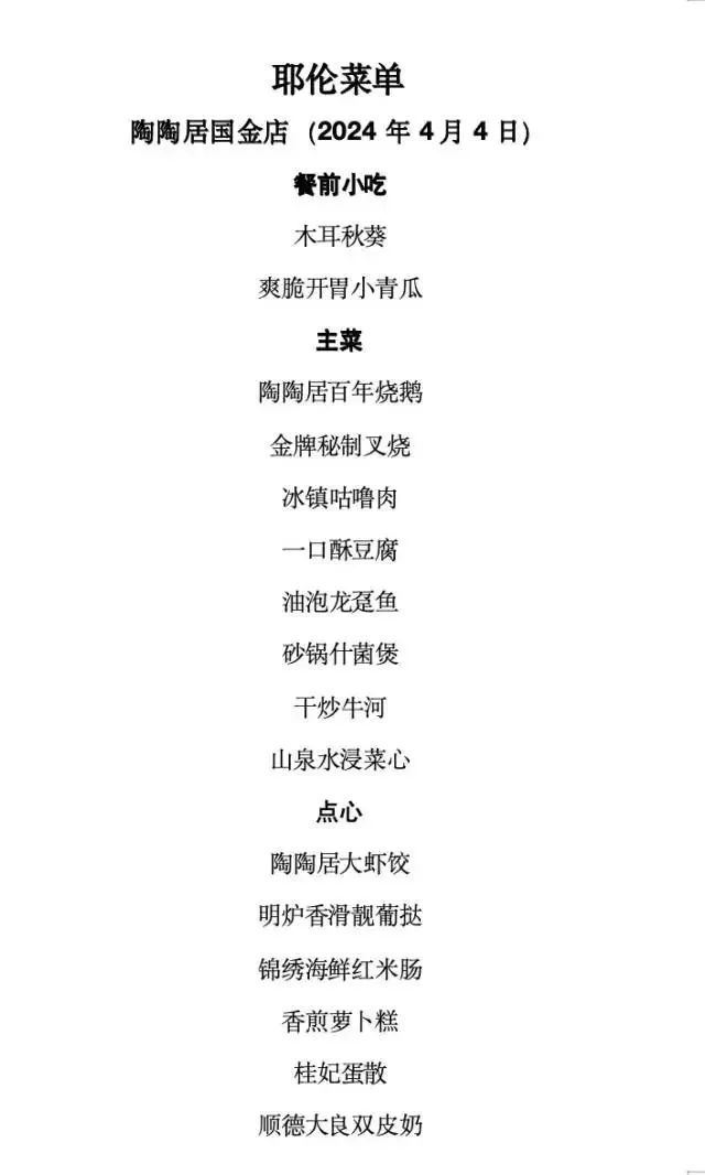據(jù)悉,此次耶倫在陶陶居餐廳吃的都是些招牌菜,像百年燒鵝、金牌秘制叉燒、冰鎮(zhèn)咕嚕肉、順德大良雙皮奶等等,下面是全部的菜單清單。