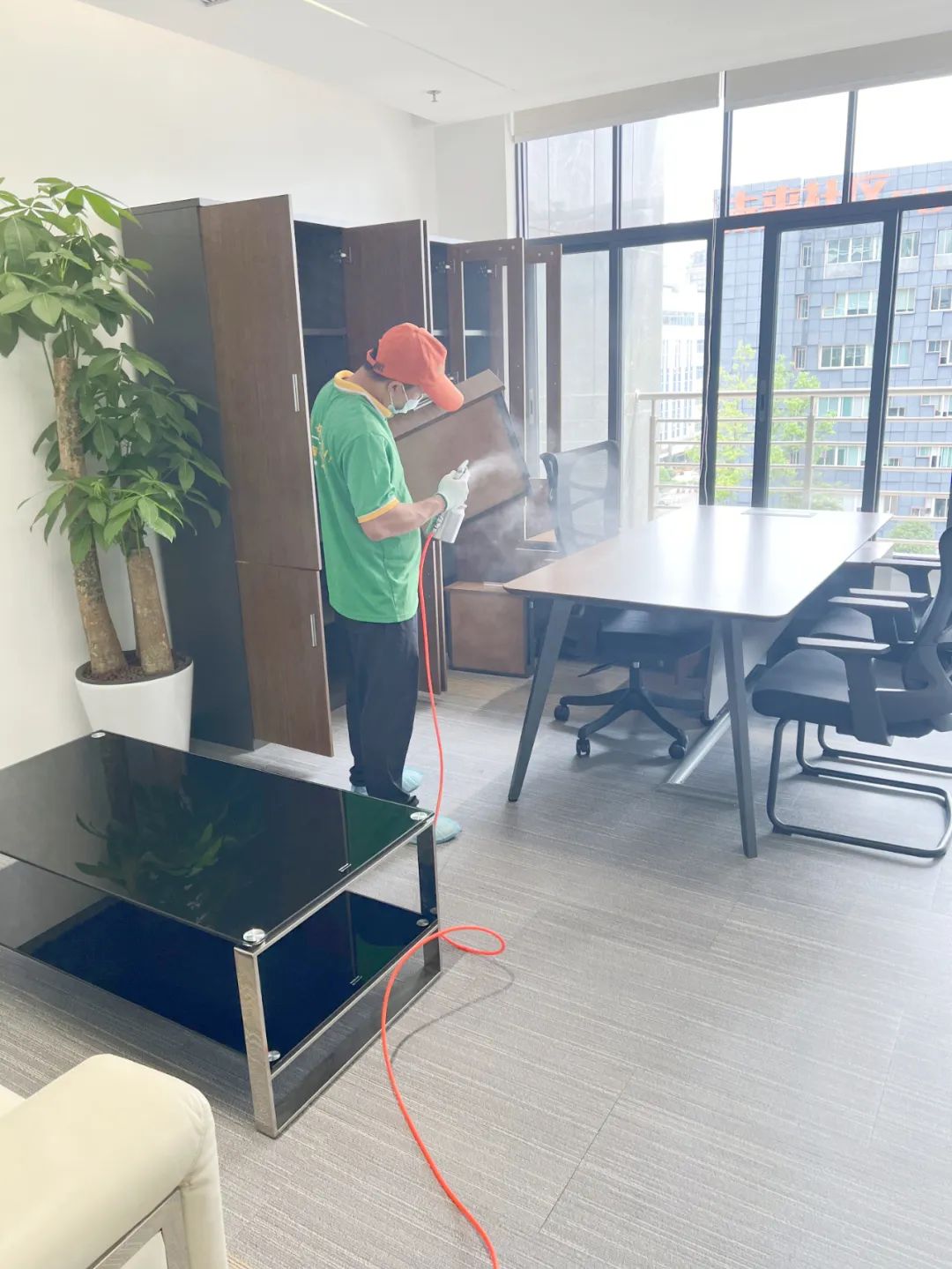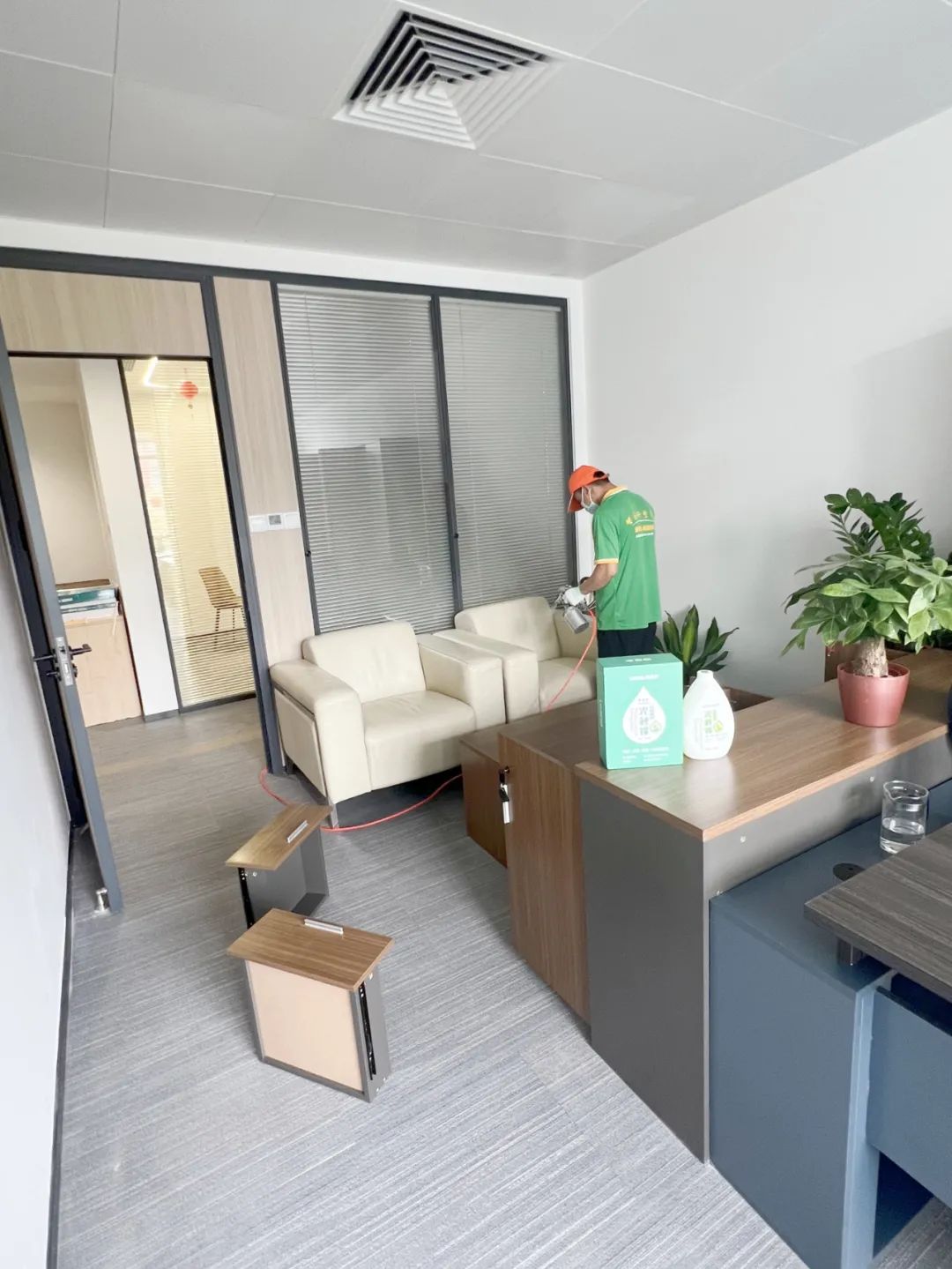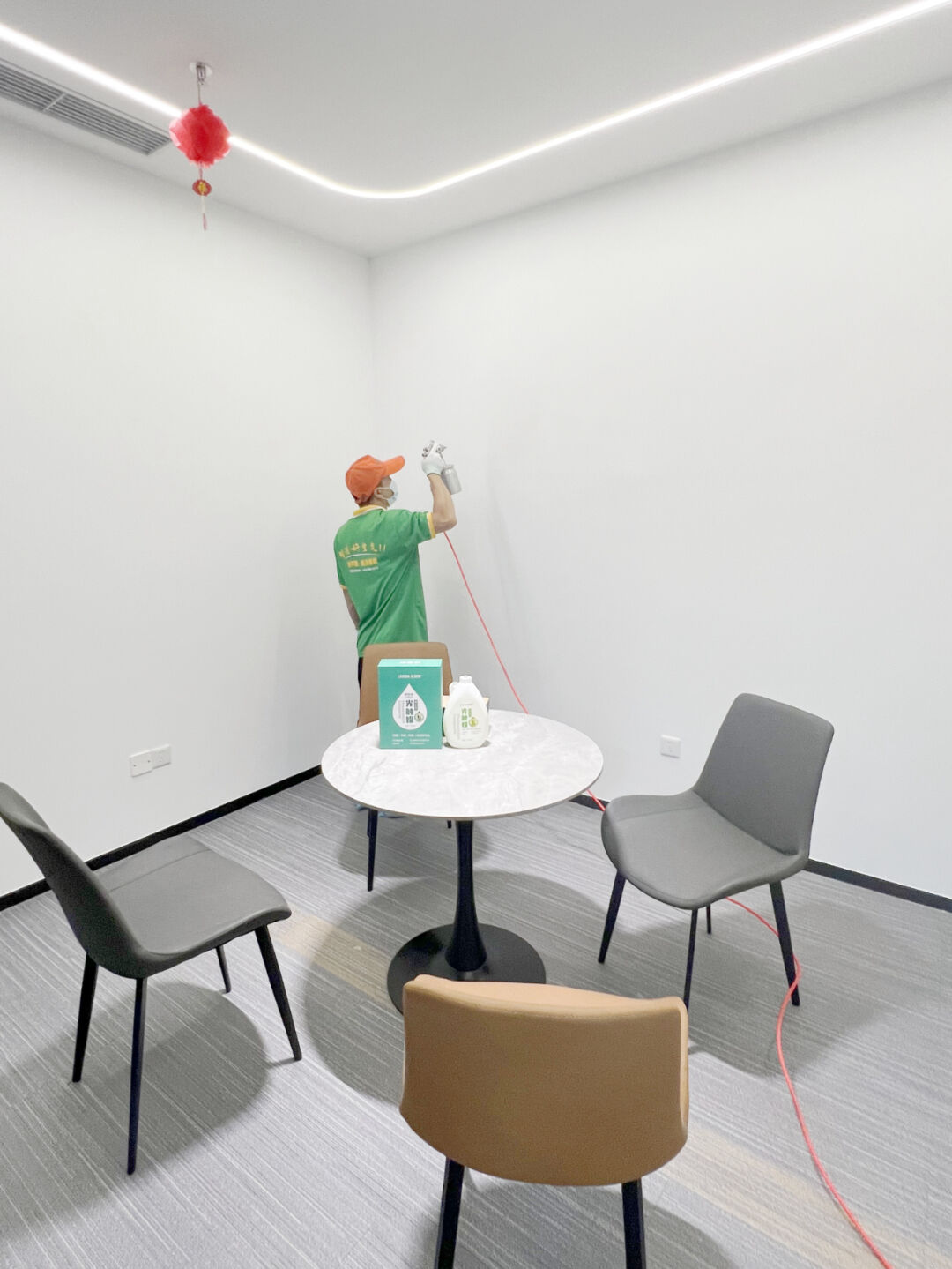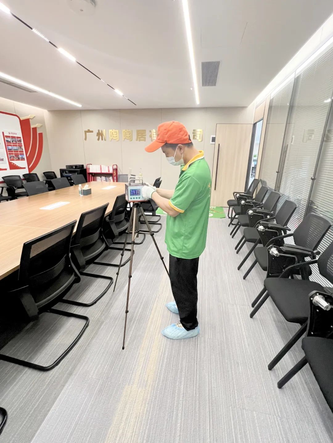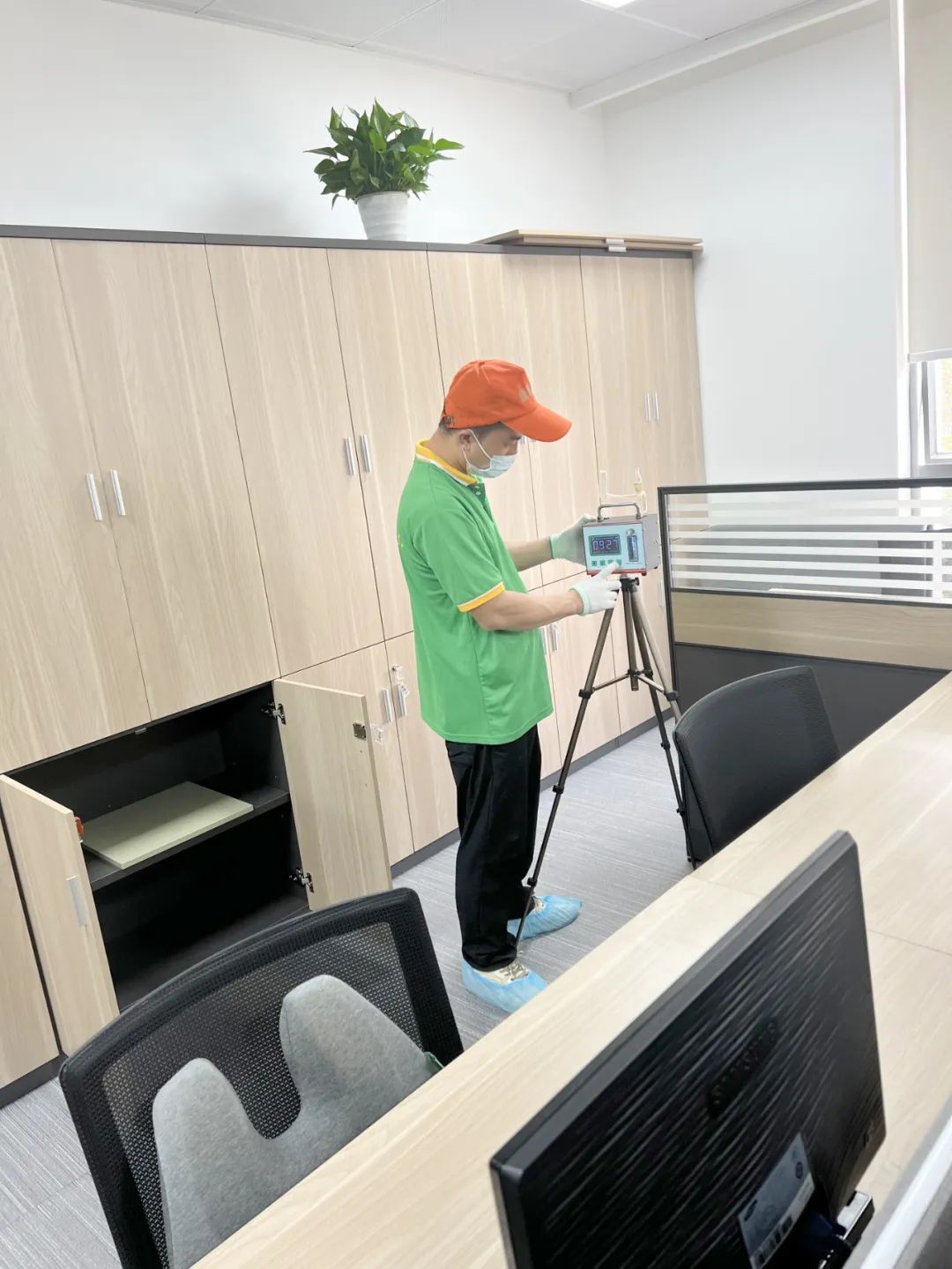 正式治理時(shí),綠居家工程師團(tuán)隊(duì)將裝了除醛產(chǎn)品的電動(dòng)噴槍,對(duì)準(zhǔn)辦公桌、辦公椅、沙發(fā)、柜子、天花等甲醛污染源進(jìn)行全方位噴涂,并且針對(duì)柜子這些甲醛重災(zāi)區(qū)還會(huì)再進(jìn)行加強(qiáng)治理,確保治理完成后甲醛、苯、TVOC等污染物降至國標(biāo)范圍。